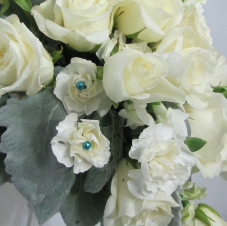 It emphasizes the bluish cast of the Dusty Miller and adds cool tones to this frosty bouquet design!