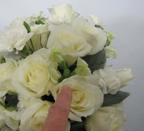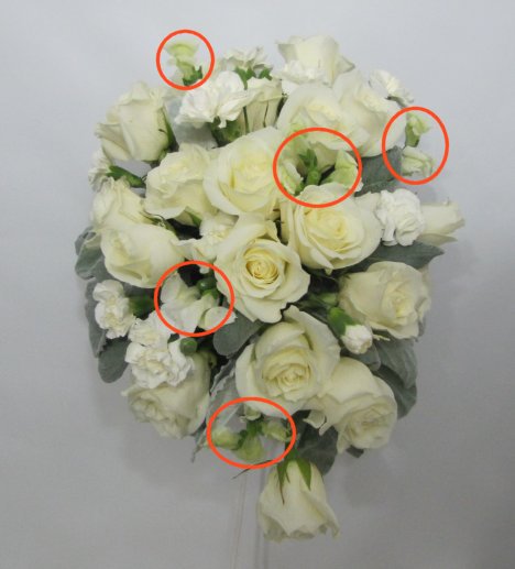 I set aside the green tops to use in corsages and boutonnieres. There is nothing wrong with using them in your bouquet if you like the contrast of the green.