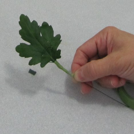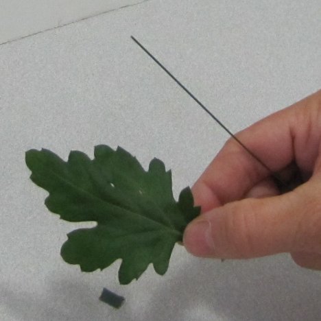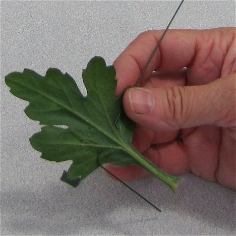If you place your thumb and forefinger over the bend in the wire, it will help keep it from tearing a hole in the membranes of the delicate leaf.