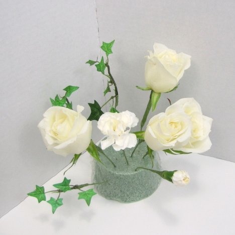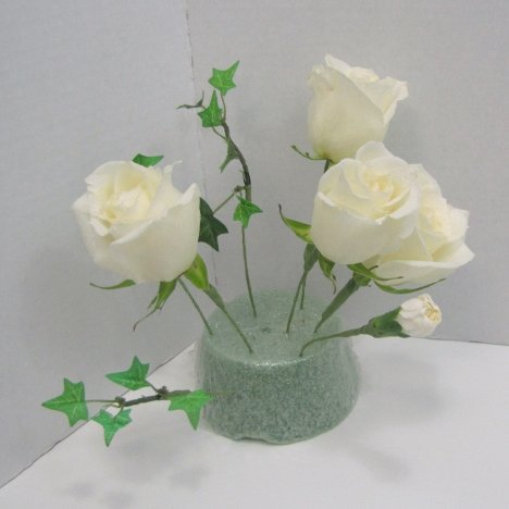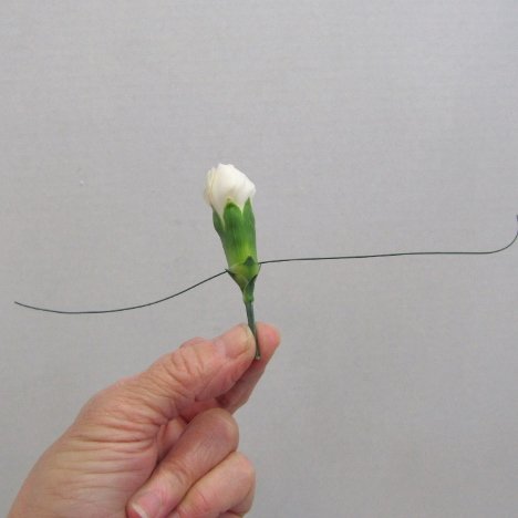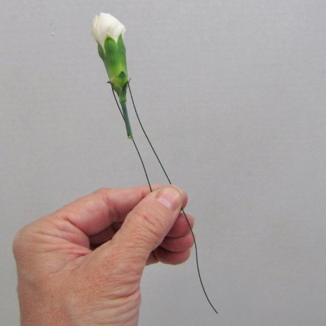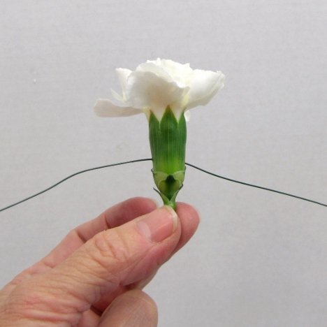 Cut both buds and open blooms to give you a variety of textures in your design. Wire the individual flower heads in the same manner as you did your roses, by piercing the calyx with a 26 gauge floral wire.