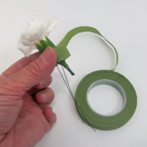 Begin taping with floral tape high on the flower head. Note how the light green tape blends well with the color of the flower stem.