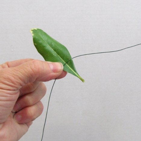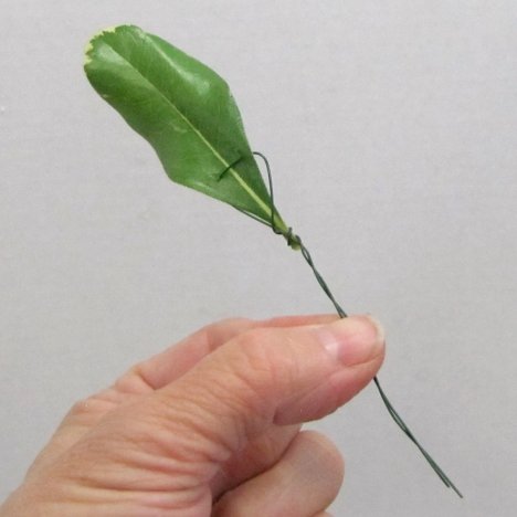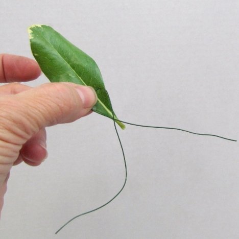 Use green stem wrap to conceal the wire. Wiring partially up the leaf like this gives you more control over bending and manipulating the leaves when assembling the corsage.
