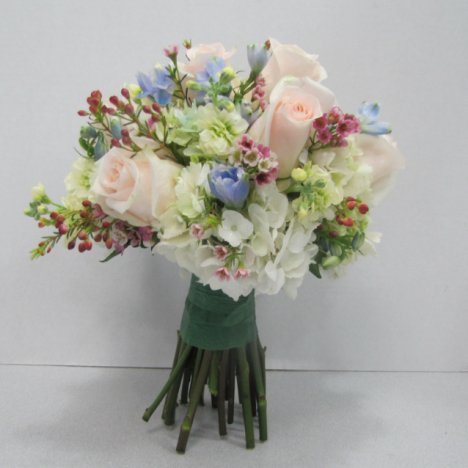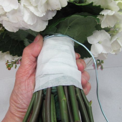 The hydrangea bridal bouquet is now completely flowered in. Now that the flowers are in place and the stems secured in the floral clay and taped in place, the bouquet should look similar to this.