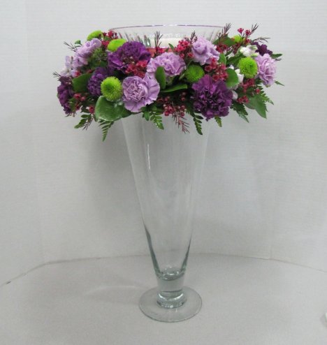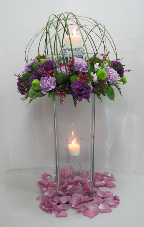 As a centerpiece, you can start with a clear trumpet vase and make your eyes go higher that the table top!