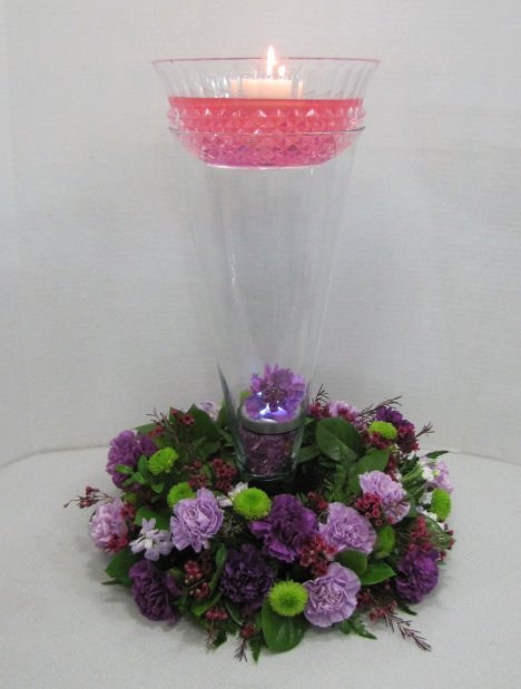 If you want the wreath on the table, set the vase inside the wreath and then rest the crystal bowl in the lip of the vase with floating candles for the flicker of candlelight.