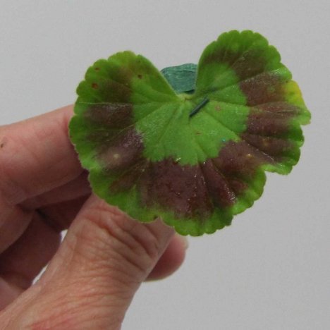 Another one or two geranium leaves, threading them with wire and taping as before.  Fill out under the flower head until you have the rose completely surrounded with your greenery.