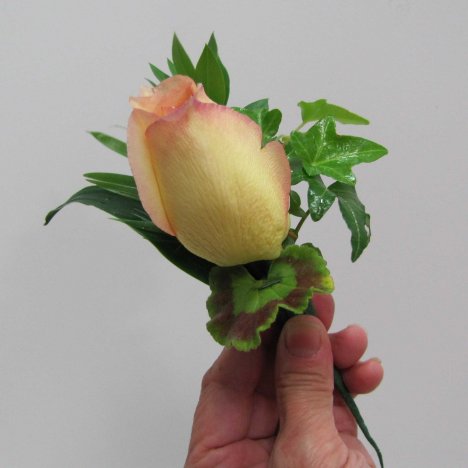 The yellow boutonniere will really pop when clusters of greenery surround the rose. From the top of the geranium leaf, you can see how the wire stitches across the face of the geranium leaf.