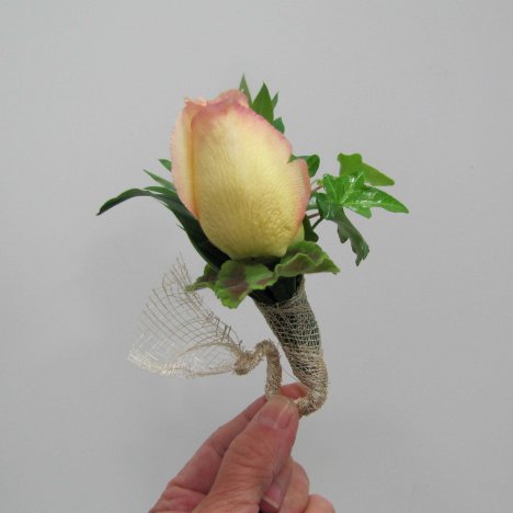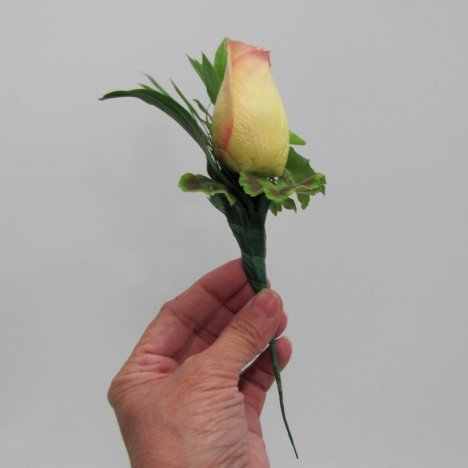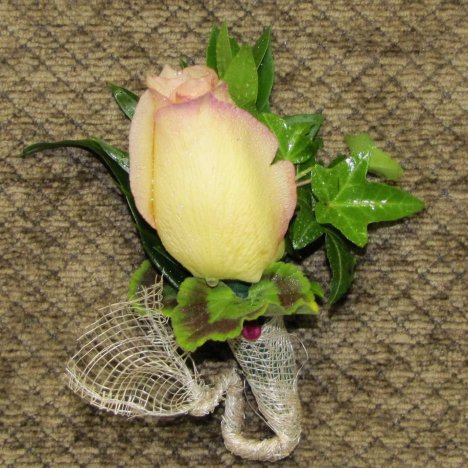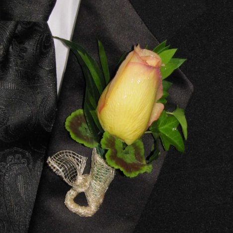 I added a single pink pearl corsage pin to enhance the pink edge of this yellow rose and to further secure the ribbon to the stem.  You can see how the interesting foliage creates a beautiful look in a tight cluster around the central bloom.