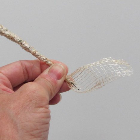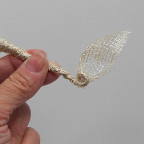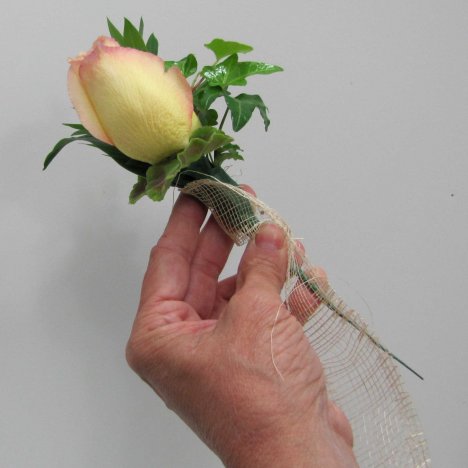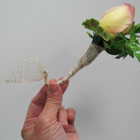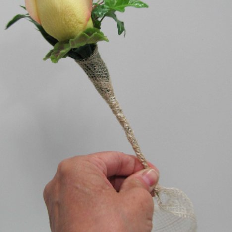 Here I've placed the cut end of a burlap ribbon at the top of the stem, right under the head of the rose.