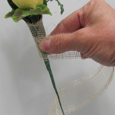 Pulling the ribbon tightly around the stem and wrapped around itself, the ribbon is continued to wrap in a downward spiral against the taped stem.