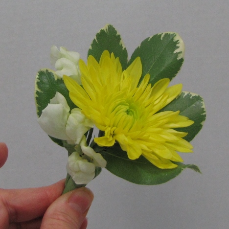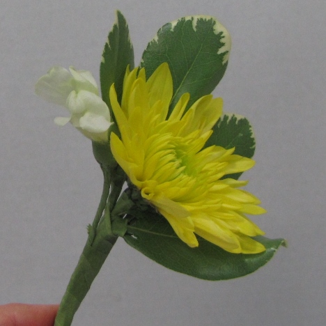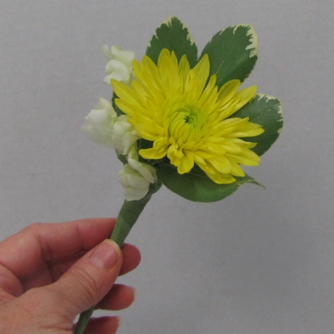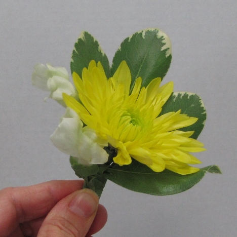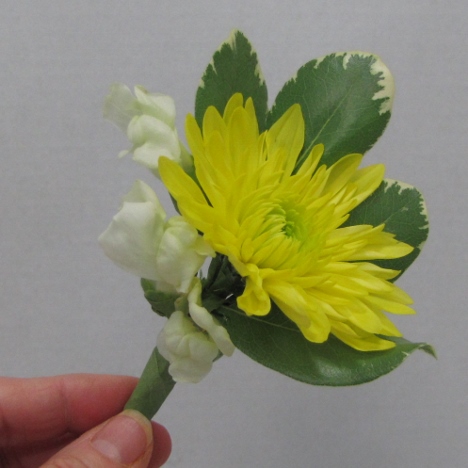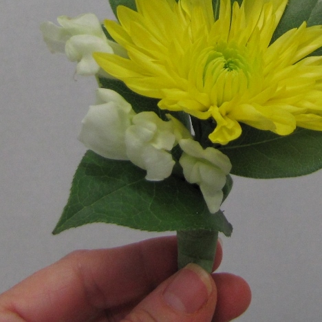 This yellow buttonhole design is framed with florets taken from a white snapdragon. I'm going to tuck this flower up under the cushion mum on the left, allowing it to peek out from under the mum petals. Tape into place.