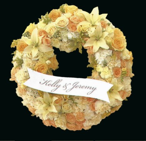 This yellow rose wreath is filled with a monochromatic mix of roses, lilies and other flowers. This can be used to either hang as a door wreath or on the tables as a centerpiece. Greening and flowering is the same either way.