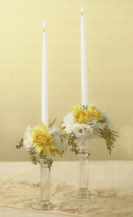 Attach the clear plate to the pillar candle holder with white florist clay. Attach the pillar candle to the plate with florist clay. Drop the ring over the place. Arrange flowers. Mist well with Finishing Touch or Crowning Glory and keep cool and away from sunlight until wedding day. It is advisable to keep tulips refrigerated if possible.